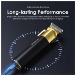 - باتری با عمر طولانی: با یک بار شارژ کامل، میتوانید برای مدت طولانی از این ماشین اصلاح استفاده کنید. این ویژگی برای مسافرتها و استفاده در مکانهایی که دسترسی به برق ندارید، بسیار کاربردی است.