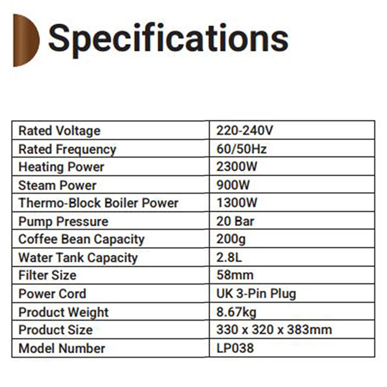 این اسپرسوساز لپرسو از ولتاژ 220-240 ولت و فرکانس 50/60 هرتز بهره میبرد. توان حرارتی 2300 وات با دو بویلر (1300 وات ترمو بلاک برای بخار و 900 وات برای دمآوری) کنترل دمای دقیق را فراهم میکند.