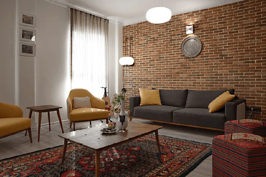 مصالحی مانند آجرهای نمای، لولههای فلزی، قسمتهای چوبی تیره و رنگهای مونوتون (یکدست) در کنار عناصر دکوراتیو خاص، فضایی مدرن، گرم و صمیمی ایجاد میکند.